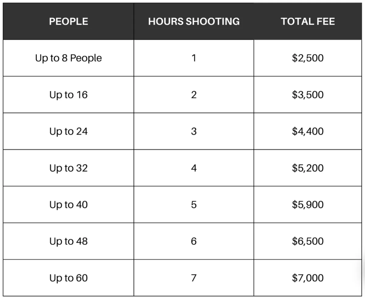 Normally, we charge a travel, setup, and equipment fee of $1,000 per shoot date, plus $350 per person, with lower rates when there are 8 or more people.